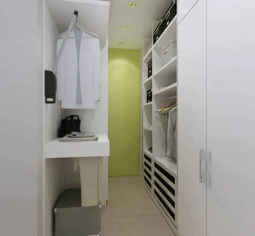 В гардеробной комнате подобного размера смело можно хранить большое количество повседневных вещей. Здесь можно смело поставить бытовую технику, например, утюг или пылесос.