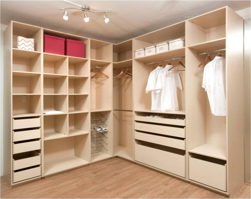При угловой планировке от перегородок отказываются, ведь стеллажи превращаются в часть комнаты. Такой прием позволяет существенно сэкономить бюджет, кроме того, вариант универсален, если площадь гардеробной менее двух квадратных метров.