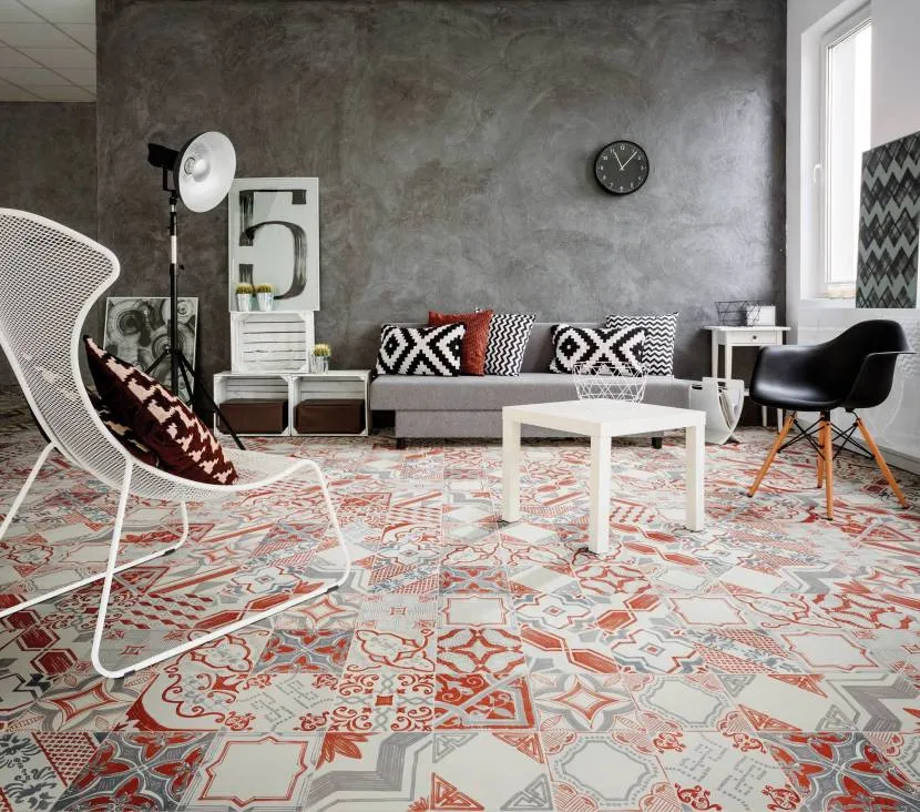 - Третий вариант – плитка в стиле кочевников. Такой вариант оформления пола в гостиной характерен для людей, которые очень любят путешествовать. Среди такой плитки распространен орнамент, имитирующий восточный ковер. Но помните, что пол не должен быть слишком вычурным и вызывающим, такое оформление испортит общее впечатление от гостиной.