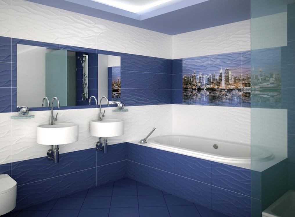 Классическим цветовым решением является помещение, оформленное в синих тонах. В оформлении используются плиты бирюзовых, голубых, лиловых оттенков. Оттенят насыщенные цвета плиты белых, серебристых оттенков.