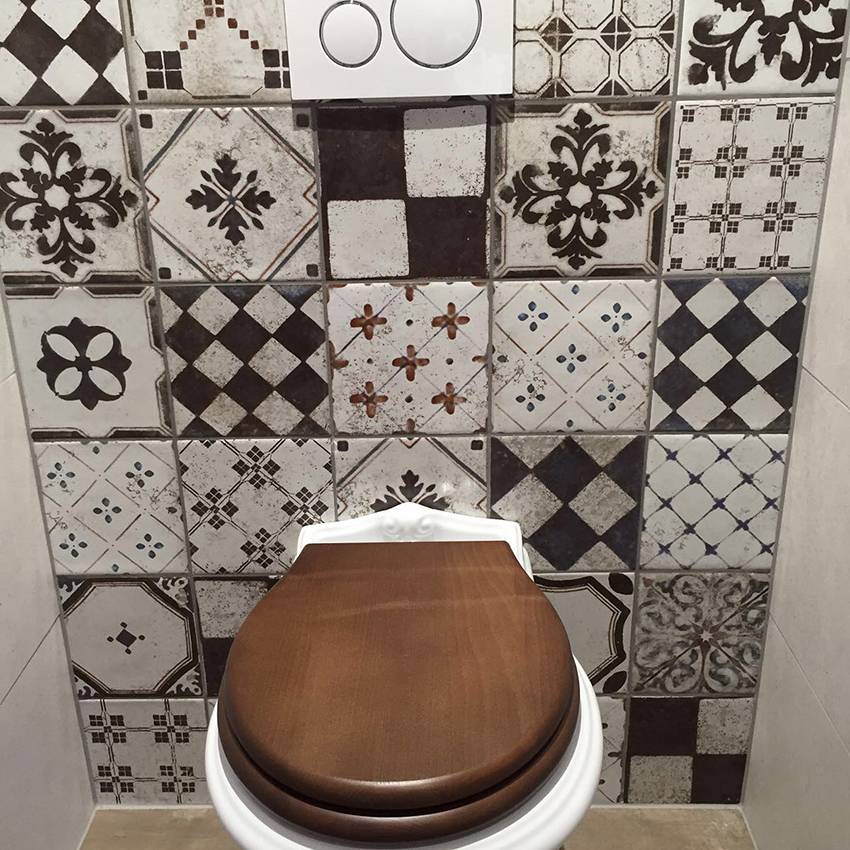 На фото справа туалет в стиле ретро. Настенный кафель под дерево гармонично сочетается с коричневой крышкой унитаза.