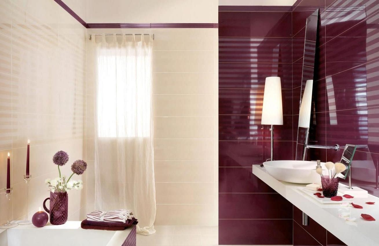 Ванная с отделкой плитами бордовых, красных, лиловых, фиолетовых оттенков дополняется белыми и пастельных элементами. Эффектно выглядят комбинации розовых, малиновых оттенков с вставками цвета фуксии. Поверхности могут быть матовыми либо с перламутровой обработкой.