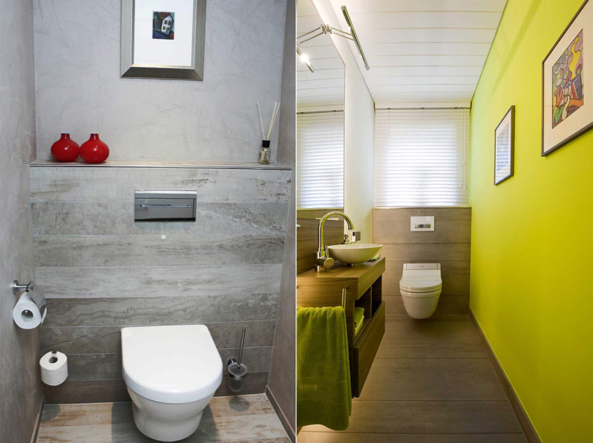 На фото слева отделка туалета в современном стиле, на фото справа интерьер санузла выполнен в классическом стиле, над бордюром оборудован люк для доступа к коммуникациям.