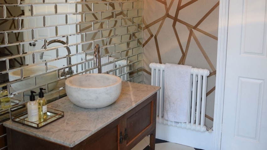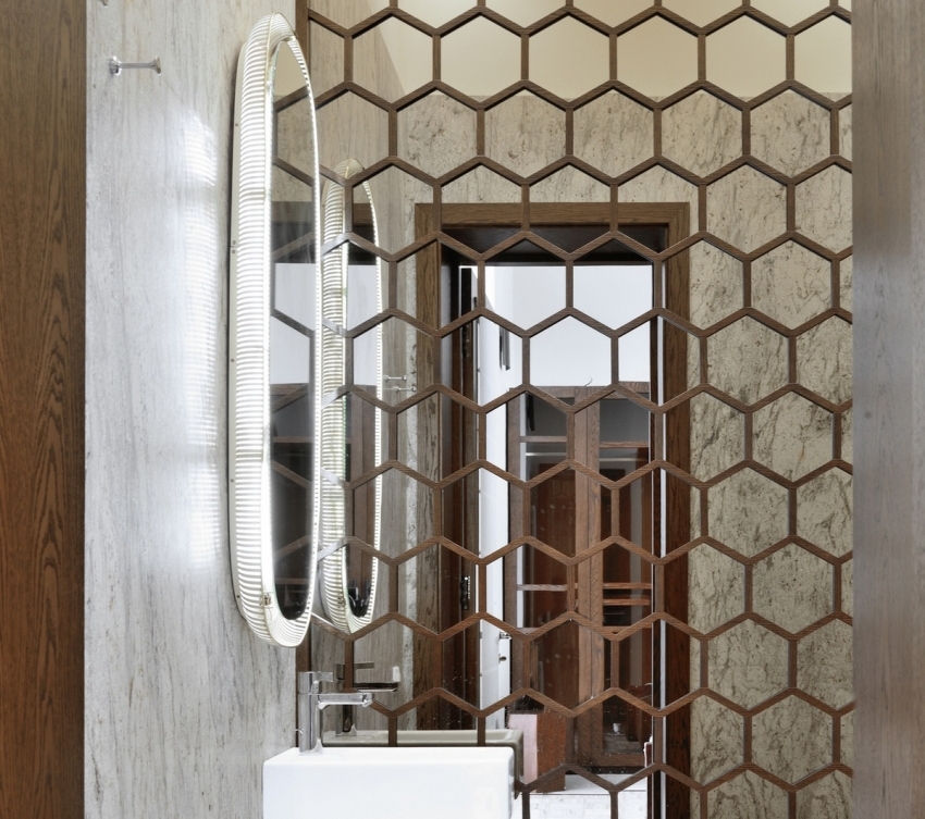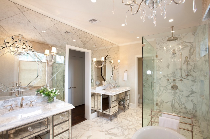 Зеркальную плитку необходимо комбинировать с другими материалами, чтобы не создать эффект «клетки» в помещении комнаты