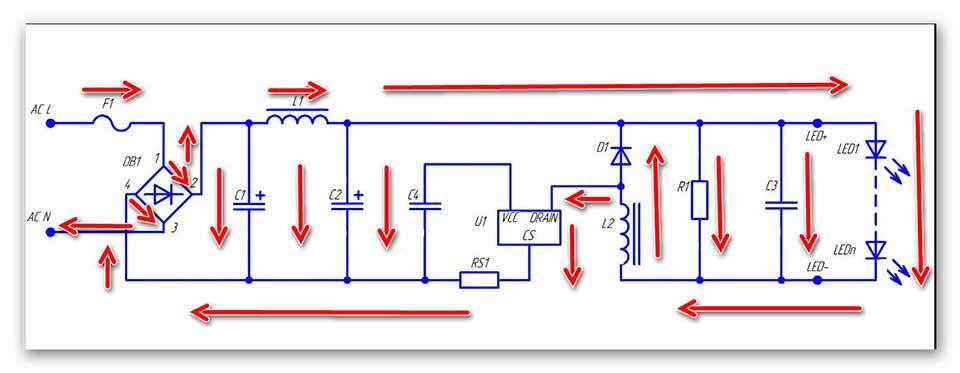 Дойдя до микросхемы (U1), он опять проходит преобразование и превращается в высокочастотные импульсы, которые сглаживаются конденсатором. Пробежав всю эту цепочку, ток наконец проходит через светодиоды филаментов и возвращается обратно в сеть.