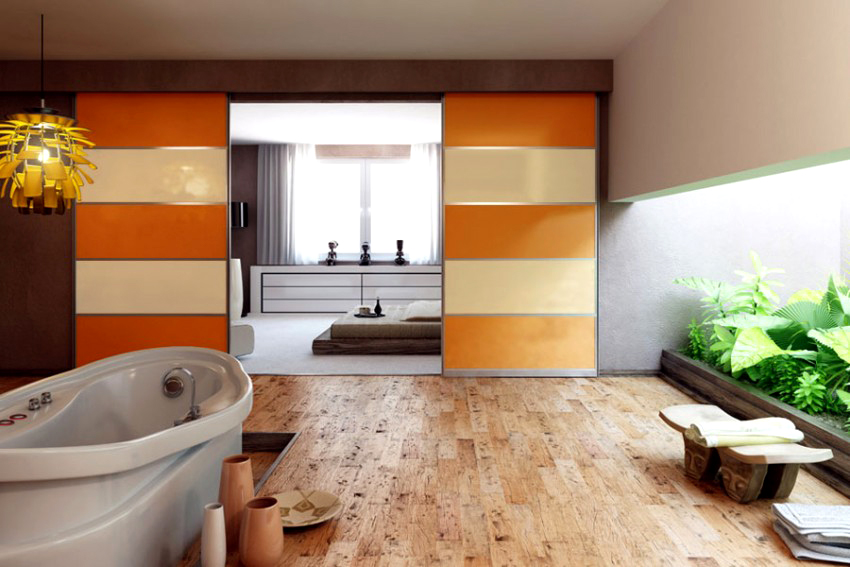 Раздвижные двери – это перегородки, которые перемещаются по рамочному алюминиевому профилю. Их выполняют из разных материалов: МДФ, ДСП, стекло, а также бумаги, зеркал, натурального дерева, ткани и кожи.