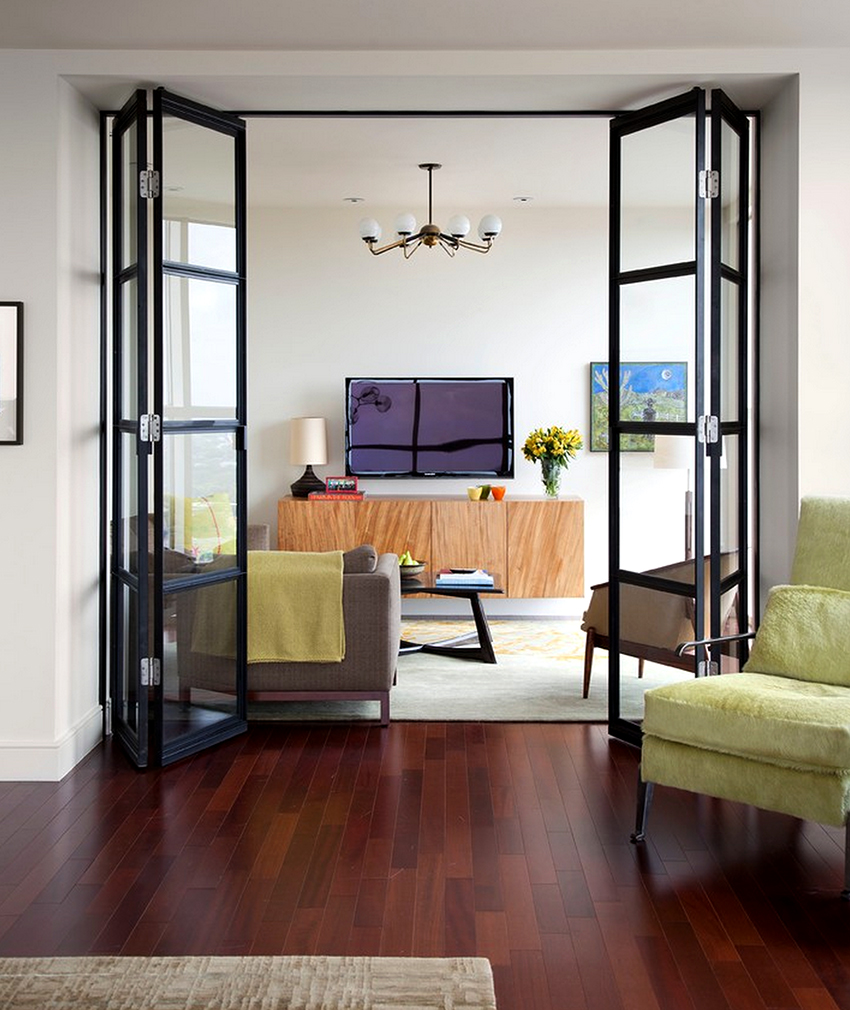 Раздвижно-складные виды дверей имеют несколько секций. Внешне такие конструкции напоминают гармошку. Подобные модели не могут полностью изолировать помещение от звуков и неприятных запахов, поэтому они чаще всего используются в качестве раздвижных перегородок в комнатах для зонирования пространства или декорирования интерьера.