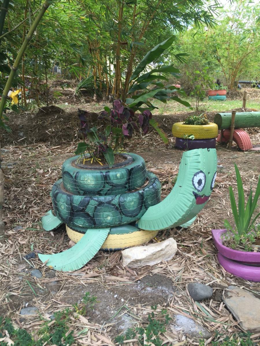 Веселая черепаха. Для его создания нужно разрезать покрышку в 4-х местах, а затем вставить в них ножки, вырезанные из другой покрышки. Делаем голову из пластиковой бутылки объемом 1,5 л. Раскрашиваем изделие. Эту поделку можно использовать как клумбу.