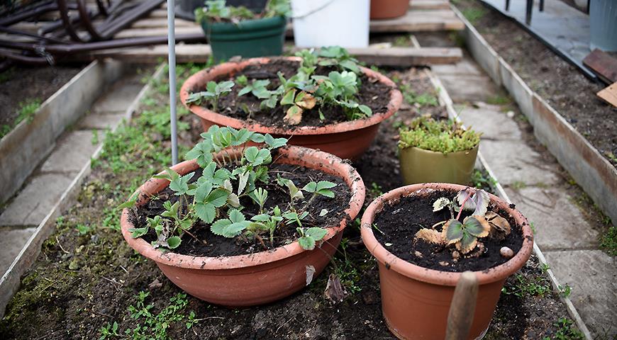 Кашпо с земляникой на зимовке в поликарбонатном парнике.
