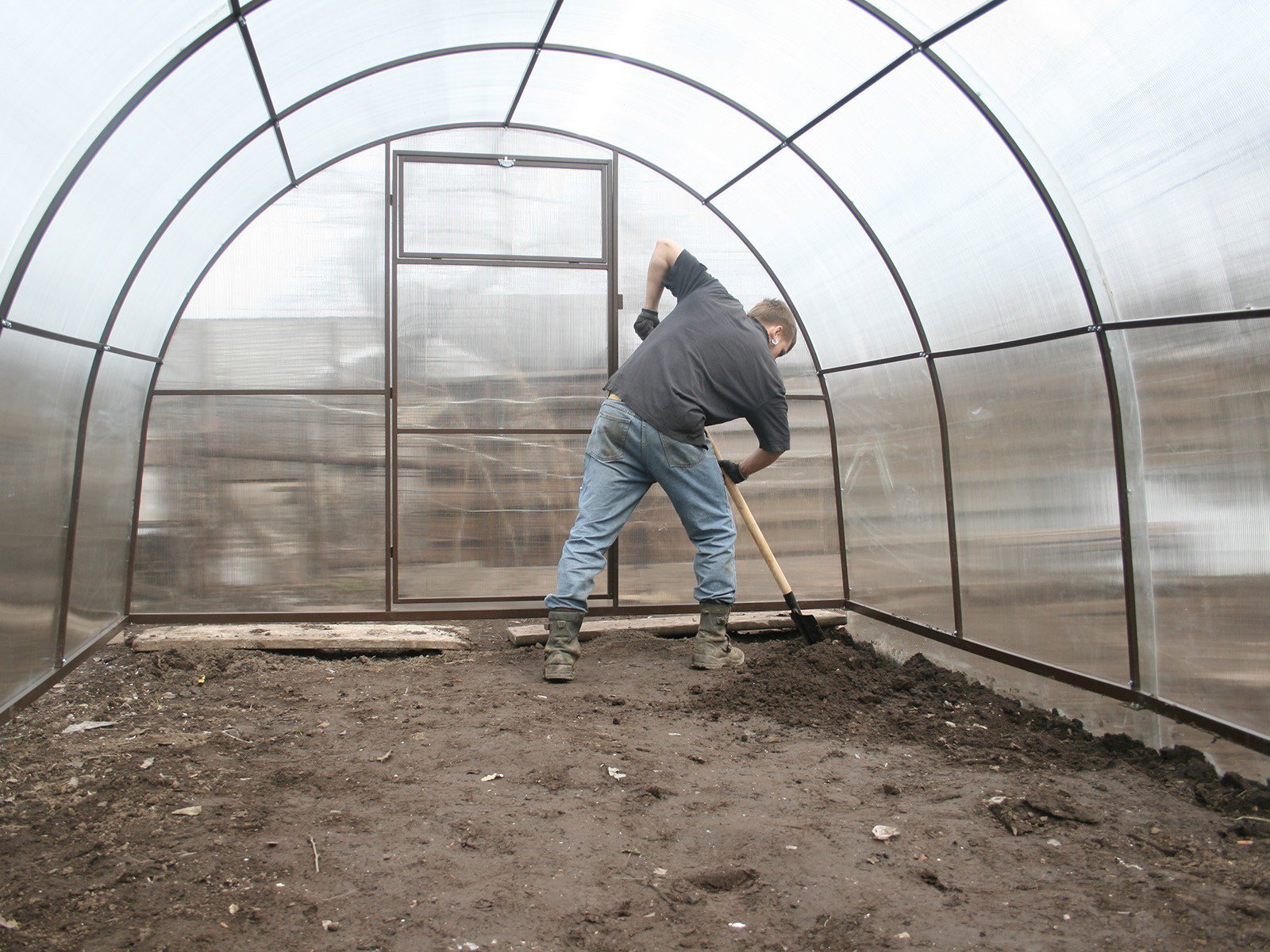 Если вы решите использовать теплицу в качестве зимнего сарая или временного дровяника, то положите на грядки временный пол! Сделать это надо обязательно, чтобы защитить землю от уплотнения и дать ей возможность “дышать”.