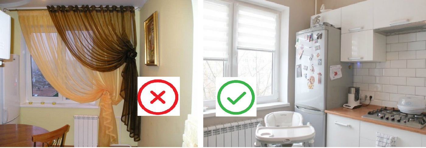 Простые, сдержанные шторы делают маленькую кухню визуально больше и легче, а многослойные, наоборот, утяжеляют интерьер.
