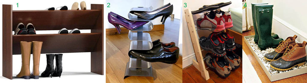 Повседневную обувь нужно сушить или в наклонном носками вниз положении (поз. 1 на рис ниже), или, лучше, на весу (но не за шнурки или на штырях/лапах!) поз. 2 и 3, или, еще лучше, со стороны подошвы, поз. 4. Стильная сушилка-органайзер для обуви на поз. 2 технологически не так уж сложна, если вы умеете обращаться с листовыми пластиками или нержавеющими металлами.