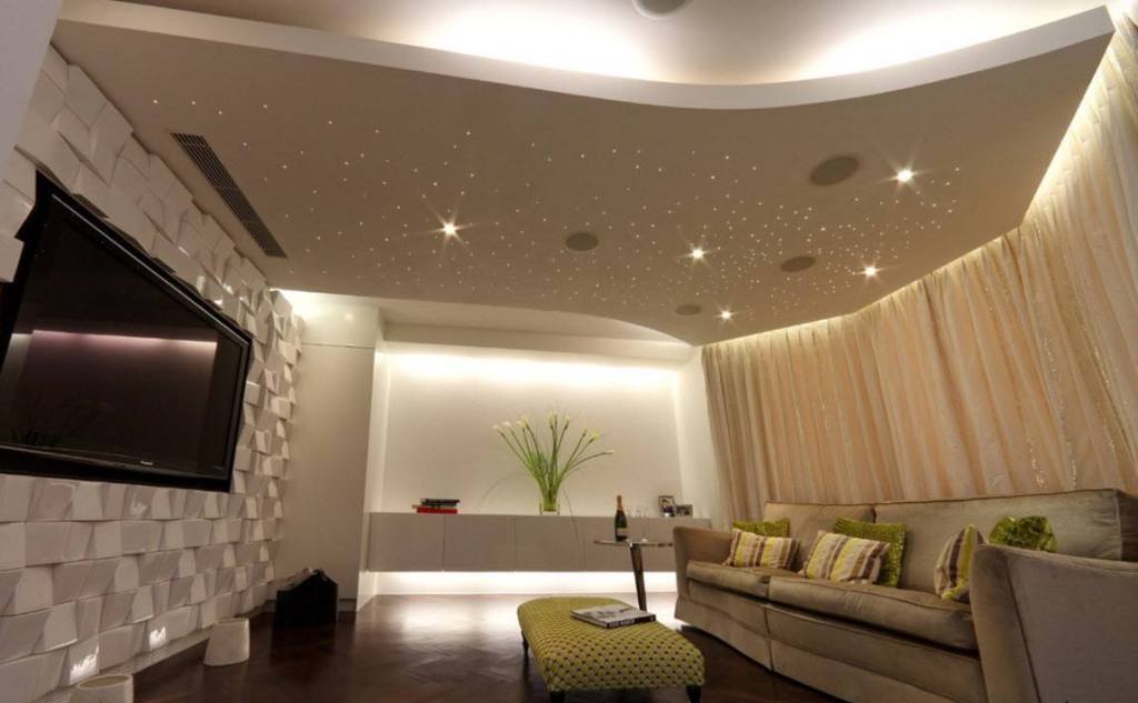 В любом случае, зал – это достаточно просторная комната с комфортной мебелью и условиями для отдыха разного вида, а значит, что и оформление потолочной поверхности должно учитывать: