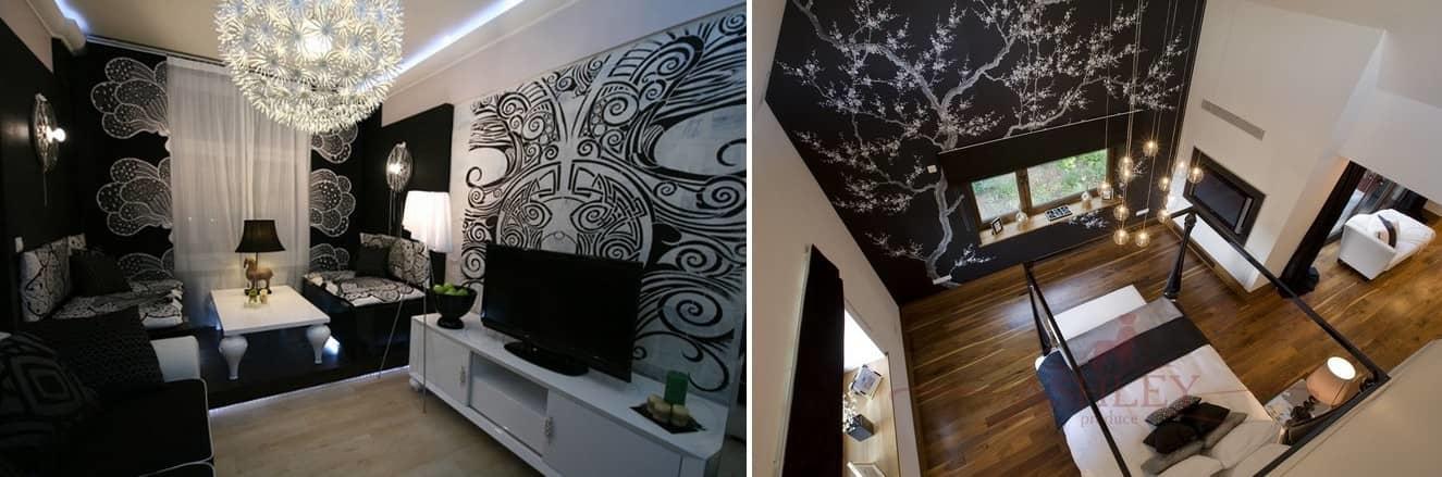 - Оклейка стен и потолка одновременно. В зависимости от того, какого эффекта вы желаете добиться, можно красиво скомбинировать обои двух видов – как на стены, так и на потолок. При условии, что потолки в помещении не менее 2,7 м, такое оформление обречено на ошеломительный эффект. Это достаточно смелое дизайнерское решение, на которое отважится не каждый. Однако результат оправдает все ожидания.