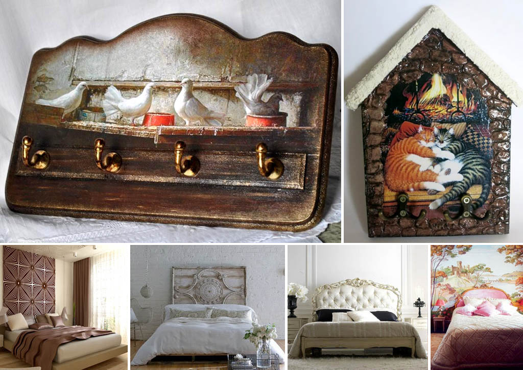 Применение пластики для декора мелкой мебели – шкафчиков, тумбочек, полочек, вешалок, ключниц и т.п. – общеизвестно. Но с не меньшим успехом, только в большим трудом из самотвердеющей пластики можно делать большую лепнину, выводя ее частями по проволочному каркасу (если ажурная) или деревянной основе. Напр., нижний ряд фото на рис. – изголовья кроватей. Крайняя справа – в спальне Жанны Фриске, она сама когда-то это фото выложила. А чем хуже остальные, вылепленные потихоньку-полегоньку, но при многократно меньших затратах?