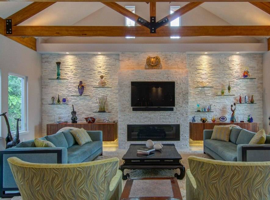 Нетипичные формы, отличные от традиционных прямоугольных, улучшают общее восприятие оформления зала в доме, в которых они применены. Во многом предопределяет вид полки ее назначение.