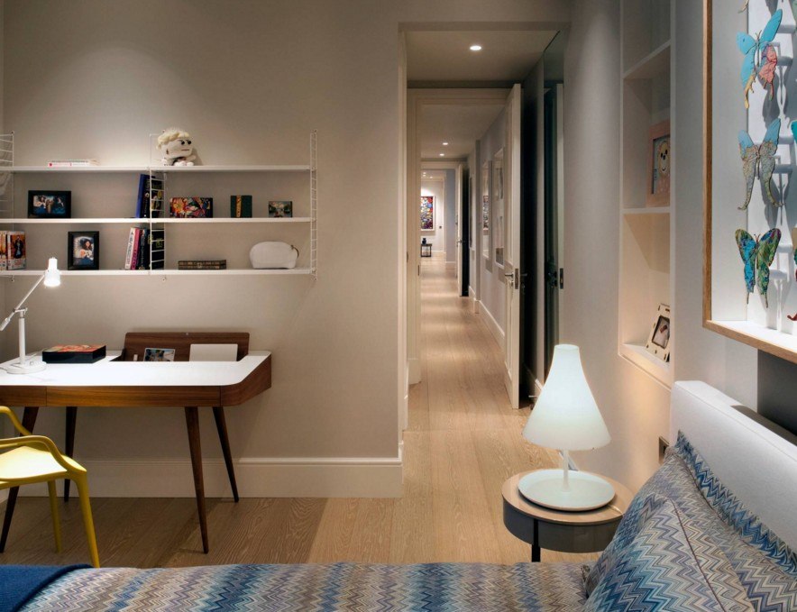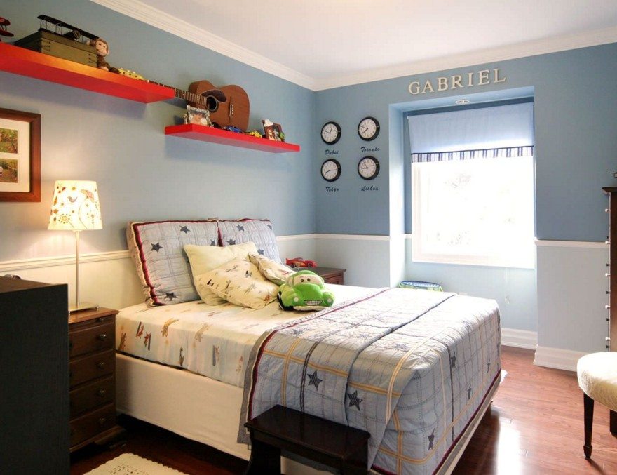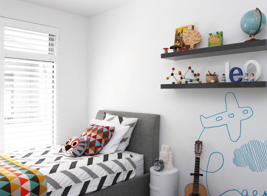 Интересная идея дизайна стен комнаты студента – набор из нескольких подвесных полок разной формы, разного количества элементов, различных цветов или одного цвета, различающихся внутренним оформлением. Например, с внешней стороны все элементы белого цвета, а внутри: