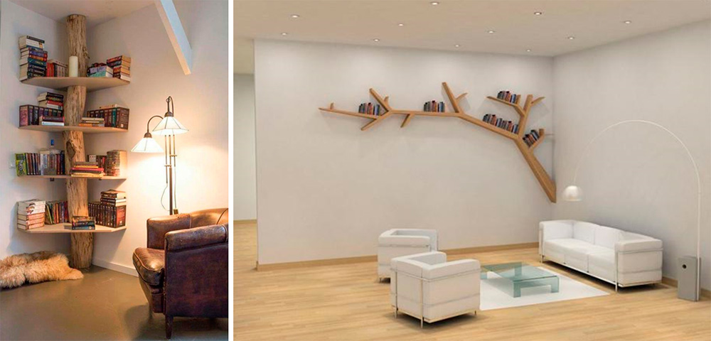 Проблема пустующих углов теперь неактуальна, когда есть потрясающий эко-декор в виде открытого стеллажа. Здесь прекрасно будет выглядеть домашняя коллекция из книг или других аксессуаров