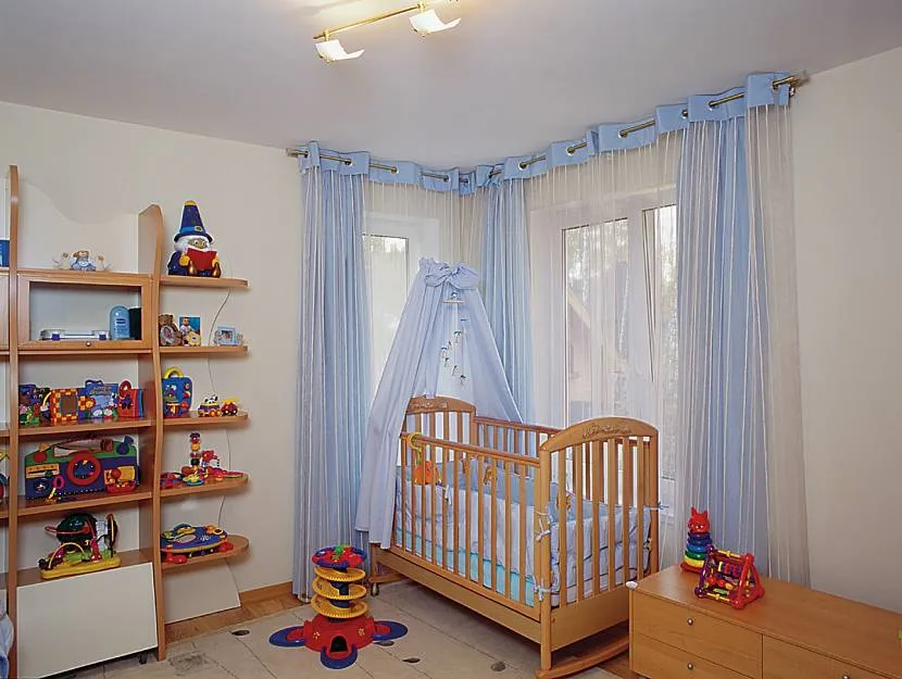 - Тюль в детскую комнату для мальчика может быть синего или голубого цвета. А также, он может быть более тёмных оттенков, но только в том случае, если комната больших размеров.