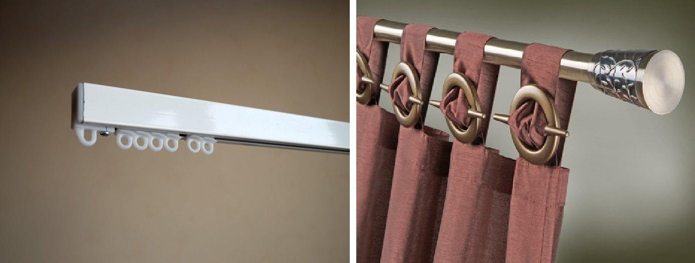 Представляет собой профиль, прямой или изогнутой формы с направляющей конструкцией, по которой двигаются крючки со шторами. Они могут состоять из нескольких рядов или составлять композиции из нескольких однорядных.