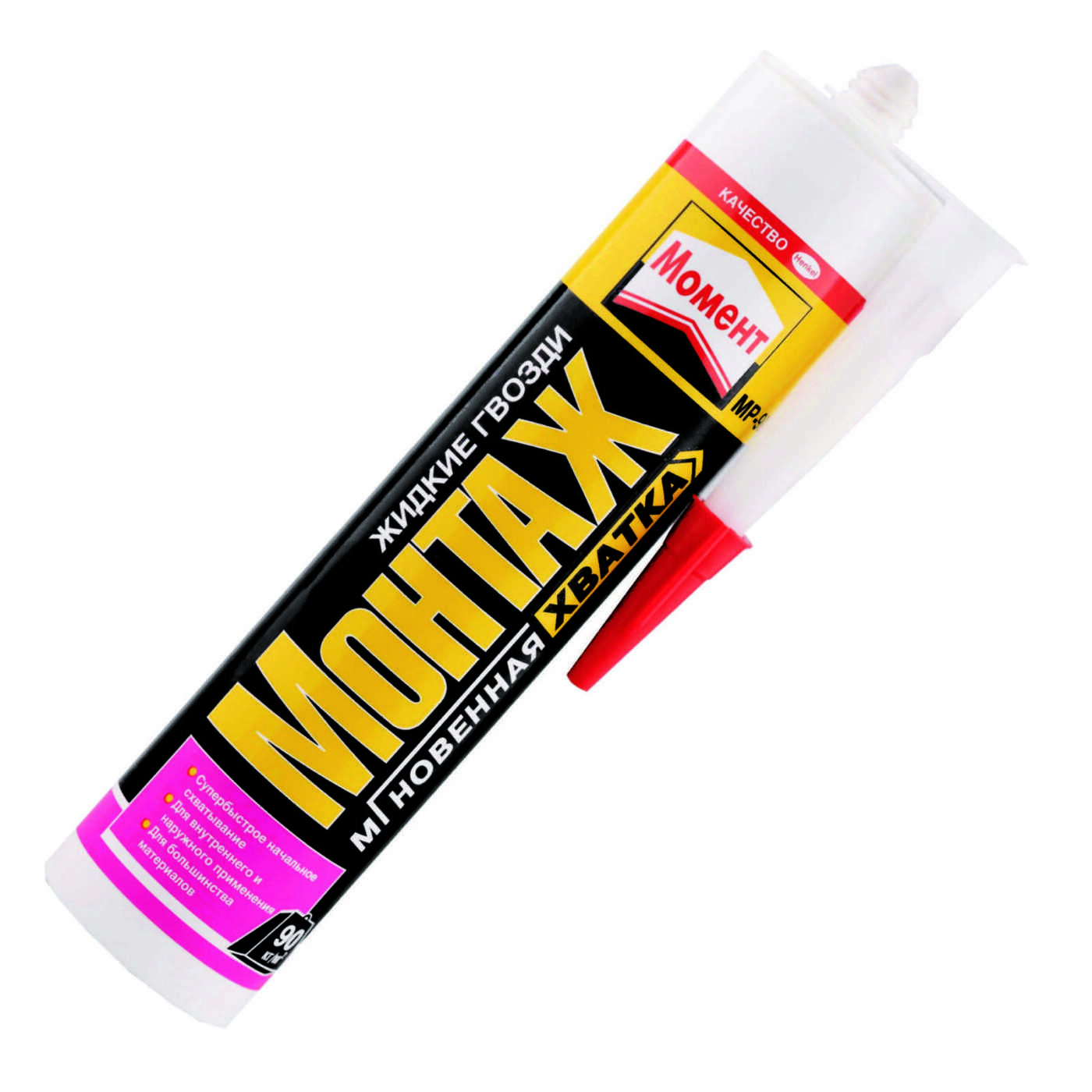 Идеальным выбором, при монтаже будут жидкие гвозди. Преимущество их заключается в том, что они абсолютно не имеют запаха и не являются токсичными. Степень высыхания и схватывания достаточно велика. Из характерных минусов, это то, что они очень сильно боятся влаги, и в этом случае, область применения сужается в значительной степени. Ценовая политика достаточно высока, это еще один существенный минус.
