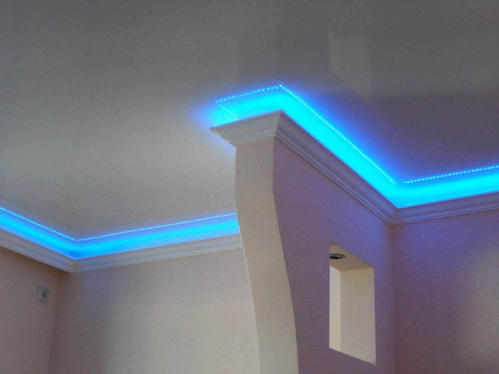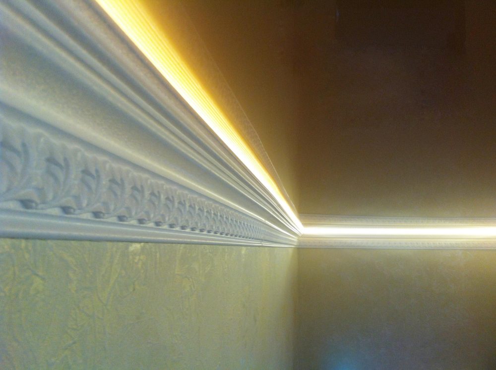 Поэтому плинтус крепят к стене, при этом между ним и потолком оставляется маленький зазор. Если зазор большой, то он служит для установки светодиодной ленты для освещения помещения. К слову, светодиодное освещение наиболее приемлемое в помещениях с натяжными потолками.