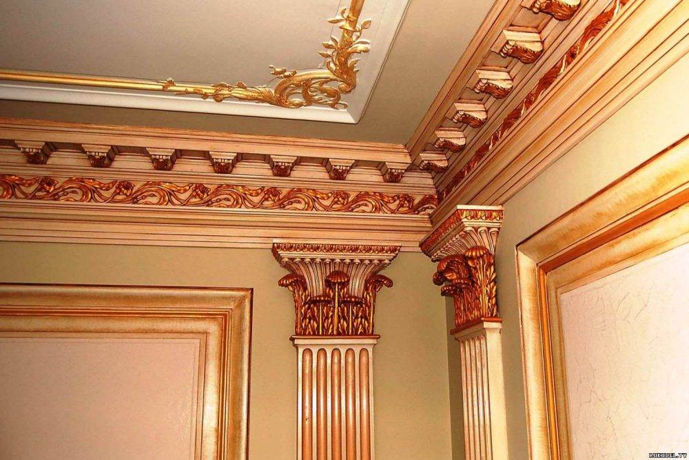 - Гипсовые. Цена ниже, нежели у деревянных аналогов. Однако, внешний вид не менее аристократичный. Своим присутствием украсит изысканный интерьер. Дает возможность воплотить в жизнь самое уникальное дизайнерское решение. К минусам стоит отнести высокую цену, значительную массу и высокую хрупкость, что усложняет процесс монтажа.