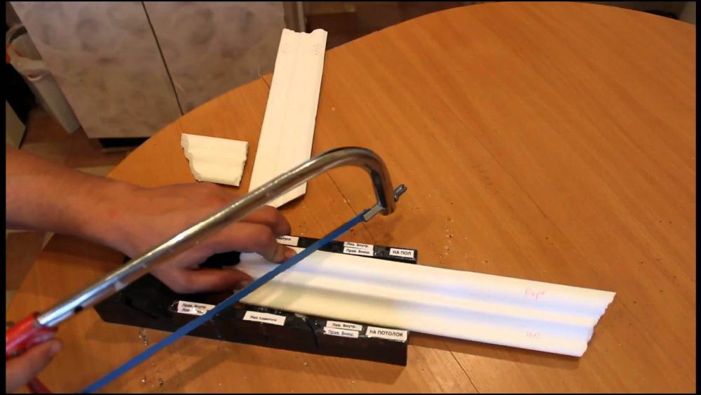 Угловые стыки проводятся под углом в 45⁰. Для точной и ровной обрезки багетов используется стусло. А сами багеты быстро обрезаются ножом. Ножовку лучше не использовать – пенопласт стает крошиться и образовывать кривые заусеницы. При угловой стыковке багет клеевая масса также наносится и на область креплений-соединений.