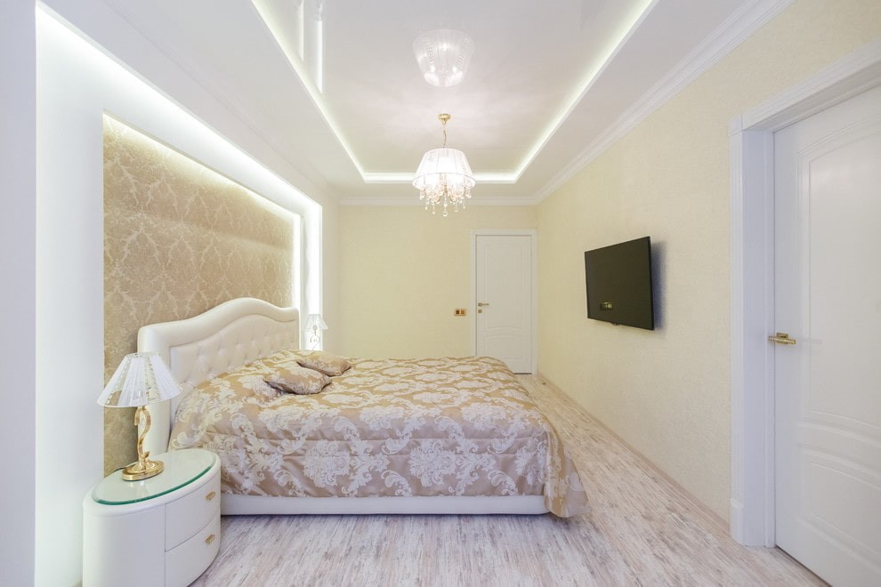 Многоуровневый потолок из гипсокартона с подсветкой визуально меняет геометрию пространства, позволяя зонировать помещение по своему усмотрению, что особенно важно для таких помещений, как спальня или кухня. Натяжные потолки скрывают недостатки чернового потолочного основания, а применение светодиодной подсветки между уровнями потолка превращает его в уникальное дизайнерское творение