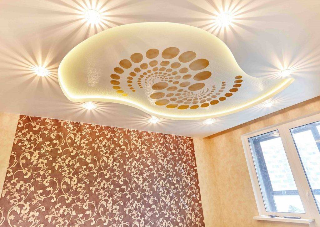 Потолок из гипсокартона с подсветкой обычно состоит из 2-х и более уровней, которые можно сделать как стандартной прямоугольной формы, так и в виде разнообразных фигур и узоров. Такие конструкции являются универсальными и позволяют полностью преобразить интерьер, независимо от того, в каком стилевом решении он выполнен.