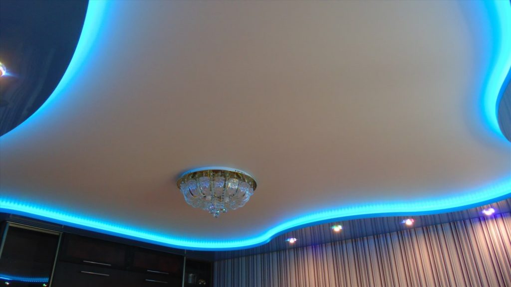 Если потолок многоуровневый, то подсветка светодиодная прекрасно сочетается с красивой люстрой. Кстати, подсветку можно выполнить не единой лентой, а ее фрагментами.