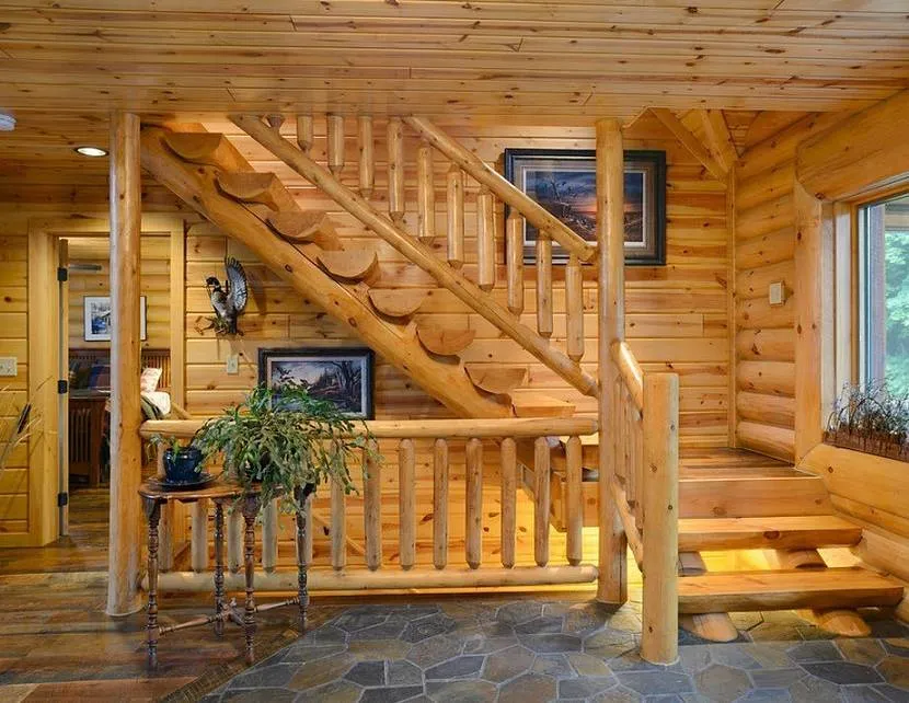 В интерьере бревенчатого дома удачным решением станет выложить пол натуральным камнем или метлахской плиткой. Стильный вид имеет ламинат или паркет с древесной фактурой. Наиболее приемлемым и бюджетным способом отделки является линолеум, обладающий огромным количеством расцветок. Для пола в коридоре не желательно применение бытового линолеума.