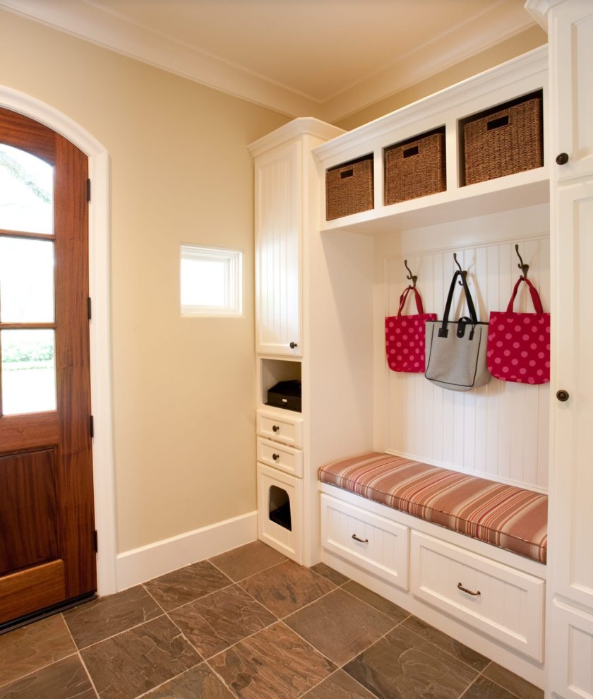 Поэтому прихожую лучше сразу зонировать, сделав дополнительный тамбур – здесь же можно будет оставлять уличную обувь, и оборудовать кладовку для инвентаря или велосипедов.