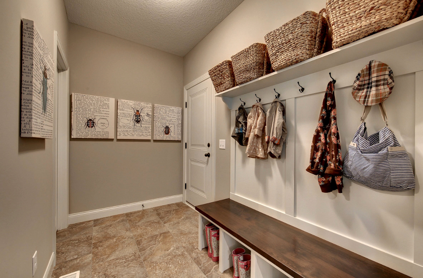 Первая комната, встречающая гостей и уставших владельцев, должна отличаться удобством размещения мебели и практичностью отделки. Здесь необходимо предусмотреть место для размещения верхней одежды и обуви, пуфик и диванчик для переобувания, полочку для ключей, сумок или зонтов.