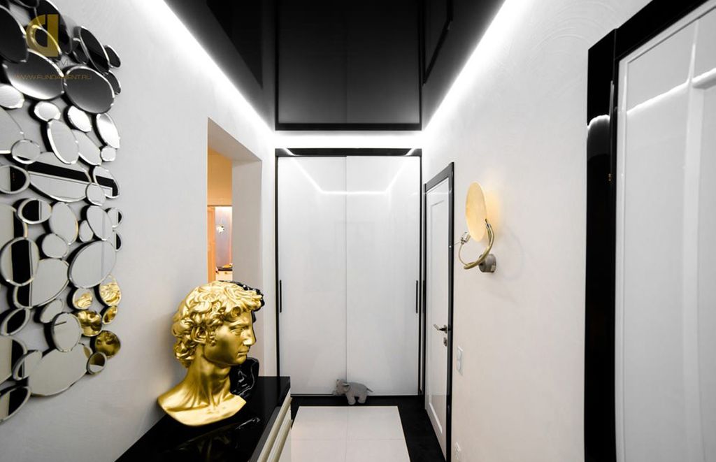 - Точечное освещение в комбинации с большими зеркалами, а также глянцевая поверхность потолка, позволят визуально расширить и увеличить помещение.