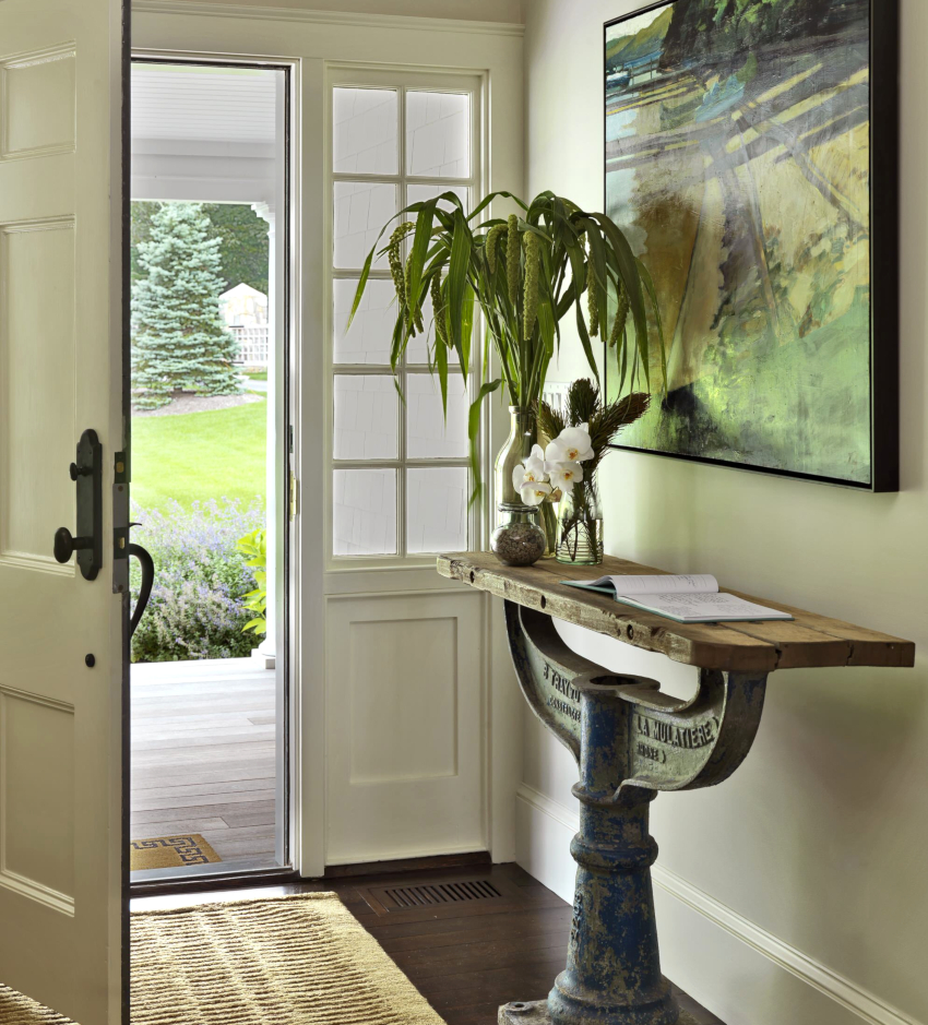 В старом деревенском доме можно встретить прихожую-тамбур. Она, как правило, небольшая, холодная, так как не отапливается. Предназначена для того, чтобы разуться и оставить верхнюю одежду. Здесь можно поставить несколько полок для обуви, кованую вешалку для верхней одежды, скамейку, пол покрыть плиткой, стены оформить декоративной штукатуркой. Уместно будет использование натуральных оттенков.