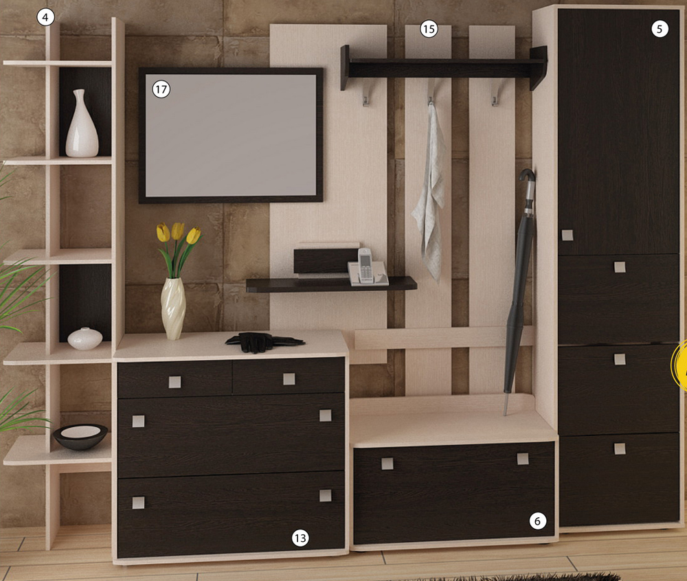 - Угол у противоположной стены: высокий уголок-вешалка с полками для обуви и головных уборов.
