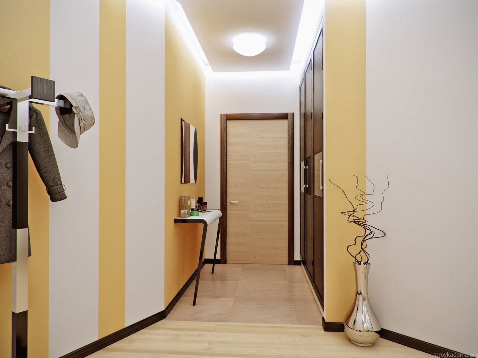Узкий коридор можно зонировать: выделить входную и вестибюльную зоны. Сделать это можно, используя разные материалы или цвета для оформления пола, потолка и стен. К примеру, зону у двери отделать камнем, а для остальной части использовать обои, краску, ламинат.