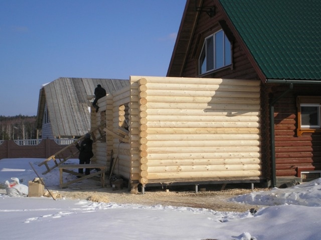 Если дом из свежего сруба, то и дополнительную комнату нужно пристраивать из дерева. Больше времени уйдет на кладку кирпичных стен, зато такое помещение прослужит в разы дольше.
