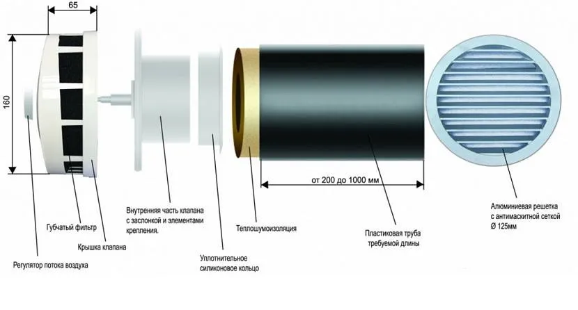 Стандартный приточно-вытяжной клапан имеет такую конструкцию: