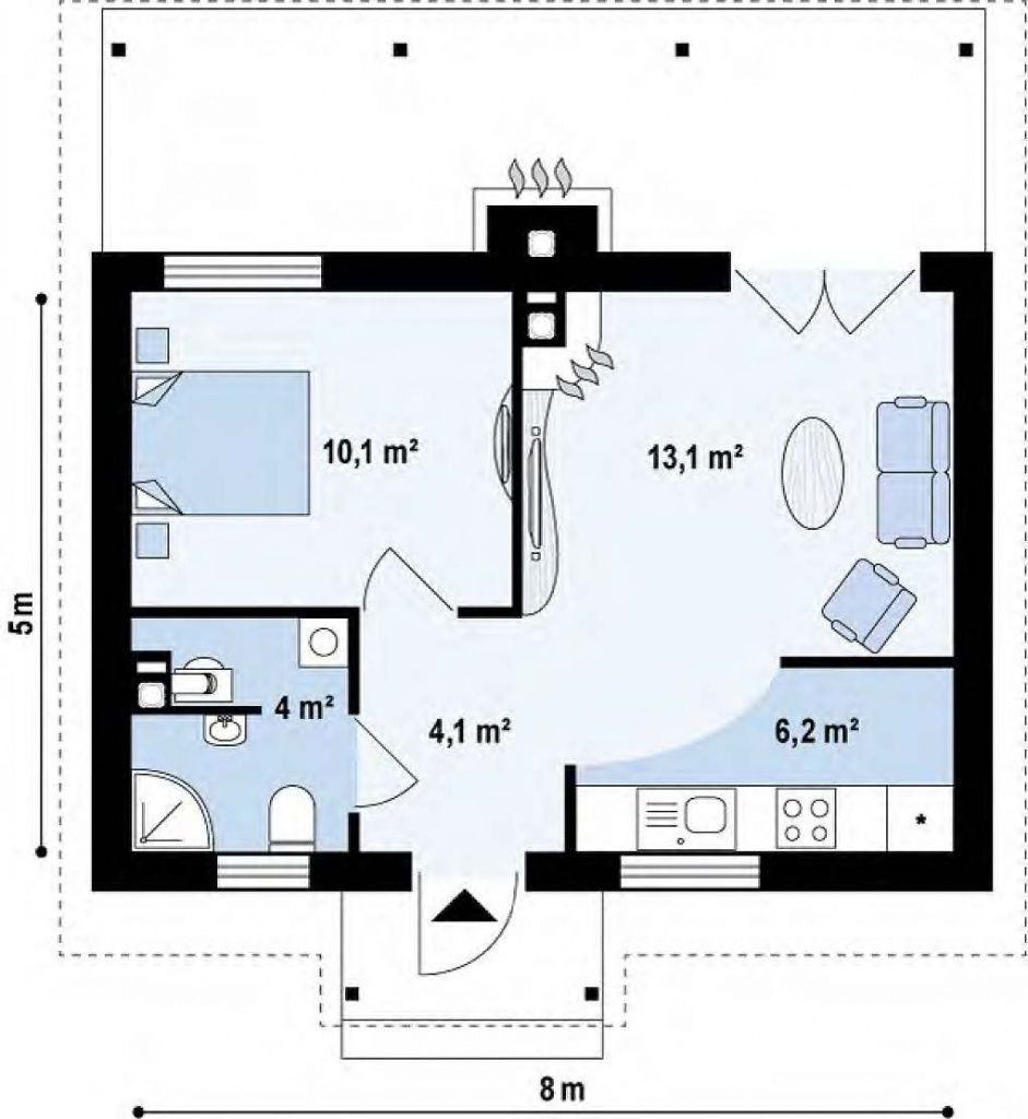 Стандартная планировка одноэтажного дома до 100 м2, включает в себя следующие помещения: