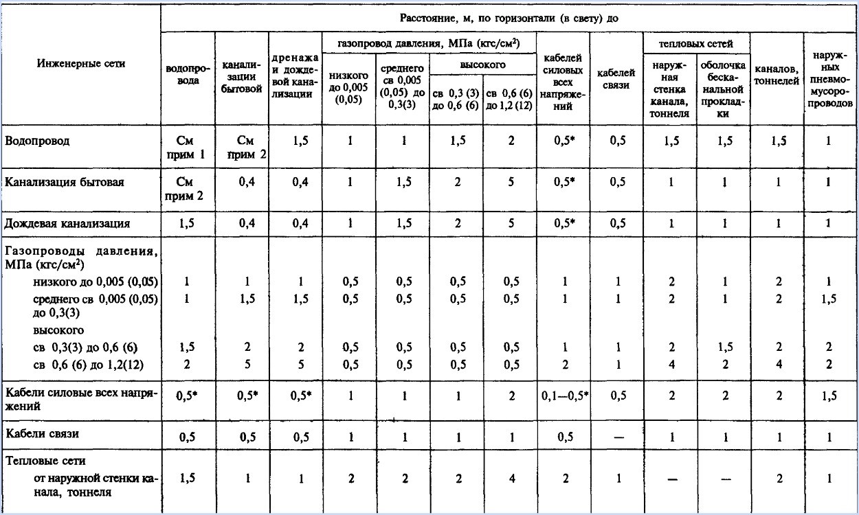 При монтаже водопровода берут следующие минимальные допуски до фундаментных плит и сетей: