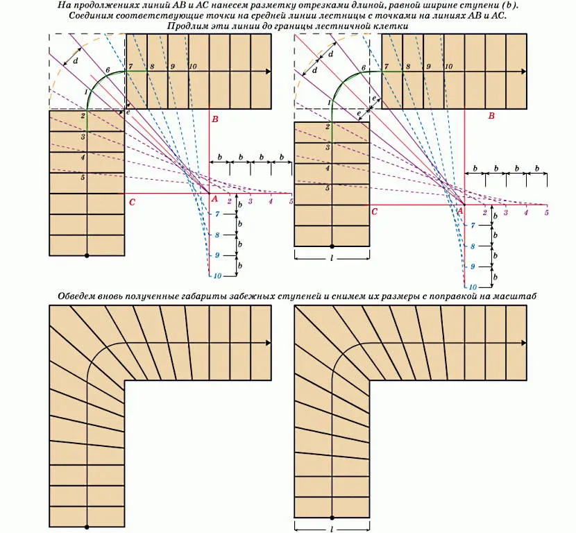 Поэтапный расчёт лестницы с забежными ступенями на 90 градусов: