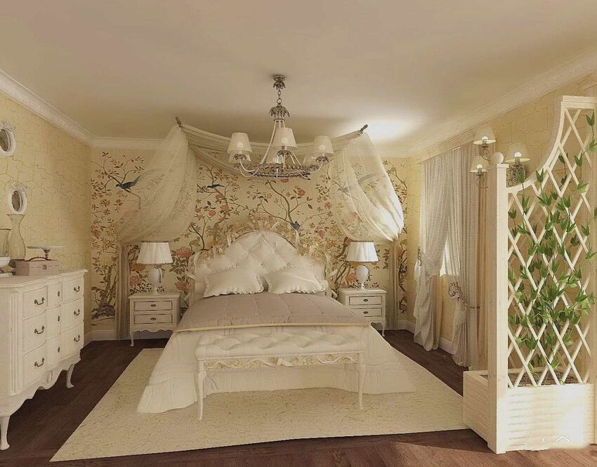 В спальне допустимы лёгкие нотки роскоши. Например, кровать с балдахином. Она может быть как деревянной, так и, например, кованой. Подобные элементы идеально вписываются в прованский стиль, их можно окрасить в светло-бежевый цвет или запанировать. На веранде, балконе или террасе можно расставить плетёные кресла и небольшие столики.