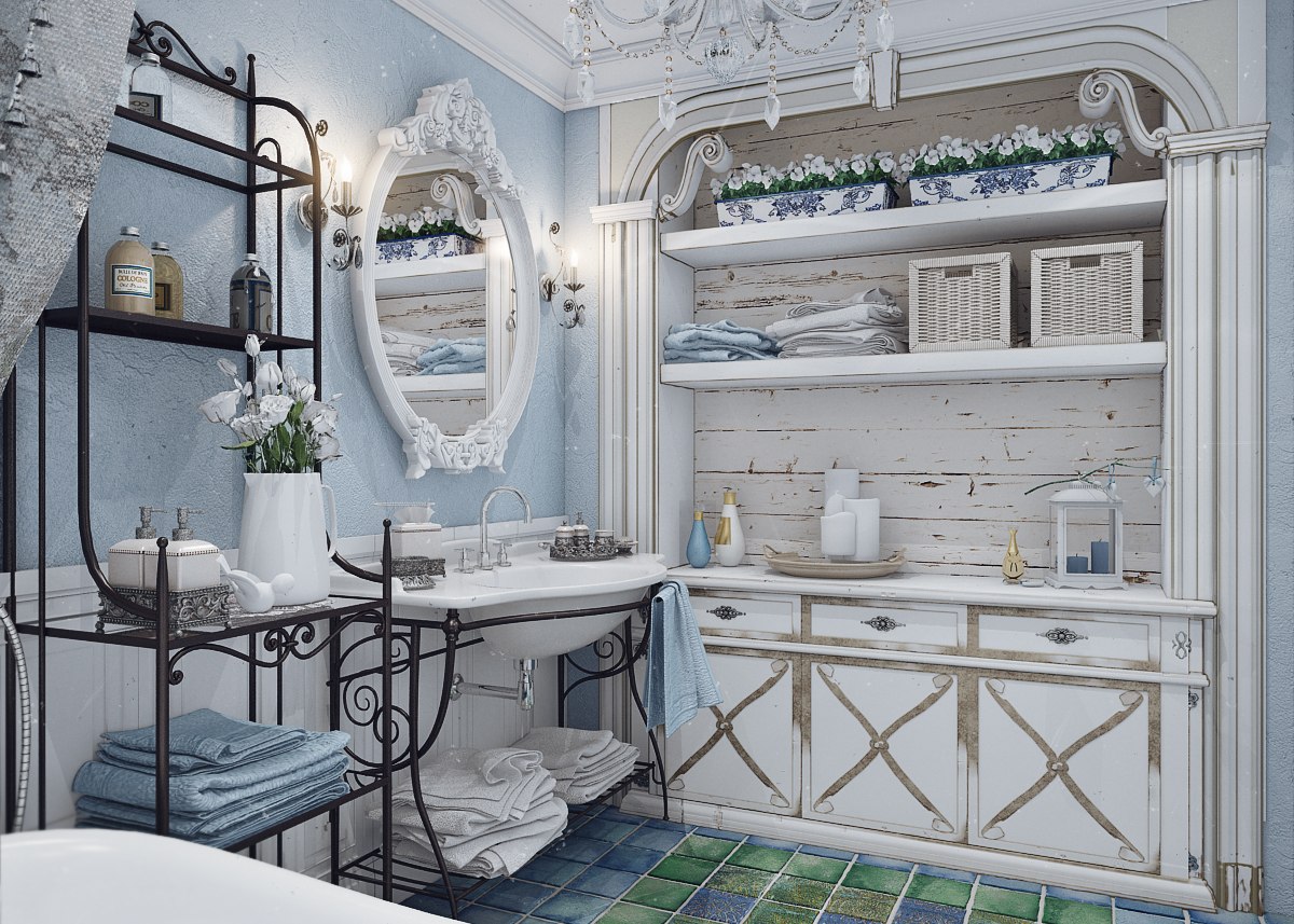 Не помешает добавить в обстановку пару изделий из макраме, цветы в горшках, плетеную тумбу для белья. И вы получите типичную прованскую ванную.