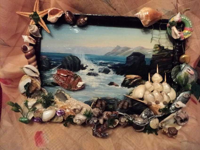 Помните, что для обклеивания рамки своими руками лучше всего брать плоские и не слишком тяжелые камушки: чтобы после не было сюрпризов в виде периодических отклеиваний от основы. Вообще, такая инкрустация имеет все шансы вписаться в абсолютно любой интерьер и будет каждый день радовать хозяев о чудесном проведенном отпуске.