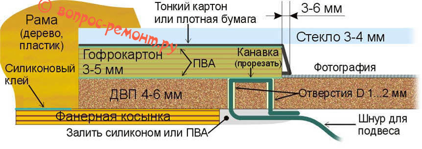 - «подрамник» из ДВП, гофрокартона и паспарту с фото вкладывается в раму фотографией вниз;