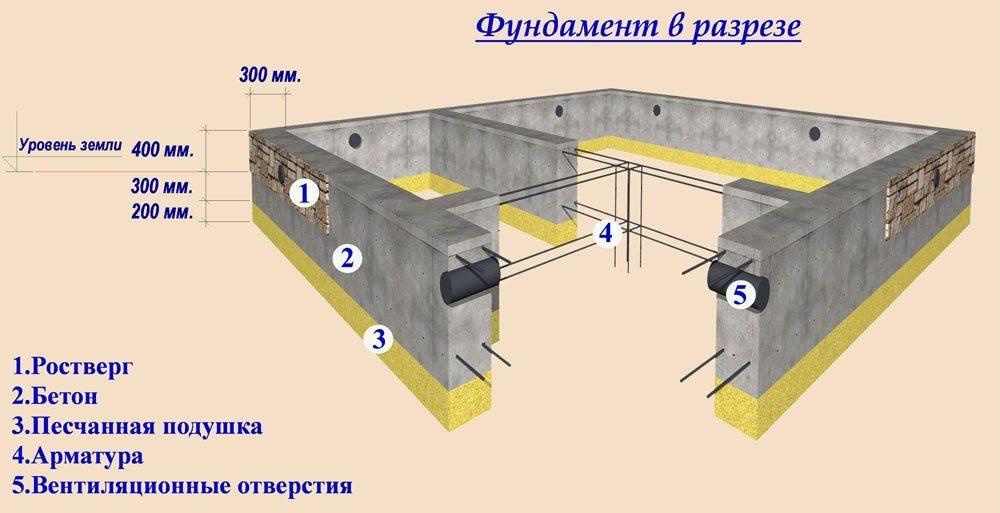 Его закладывают выше уровня промерзания, на глубине 200-500 мм от поверхности. При невысокой стоимости изготовления для этих фундаментов характерна высокая надежность, они служат без ремонта по 15-20 лет.