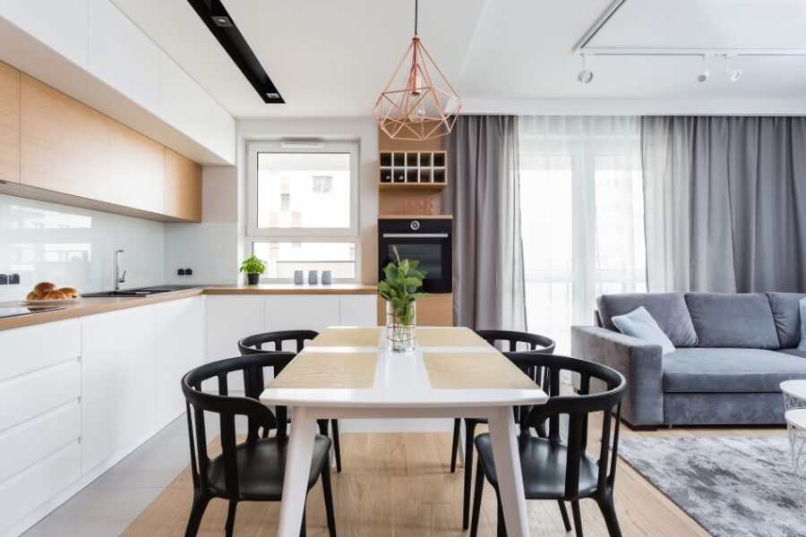 Если есть достаточно места можно не обращать внимание на форму стола, но на площади меньше 7 м2, круглые и овальные модели лучше не использовать. Тут лучше подойдет квадратная или прямоугольная форма