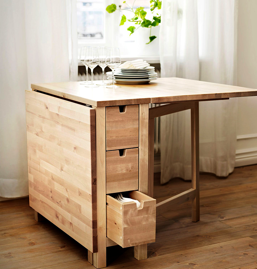 Также существуют более компактные модели, такие как раскладные столы. Изделия выполняют различные функции и экономят используемое пространство.